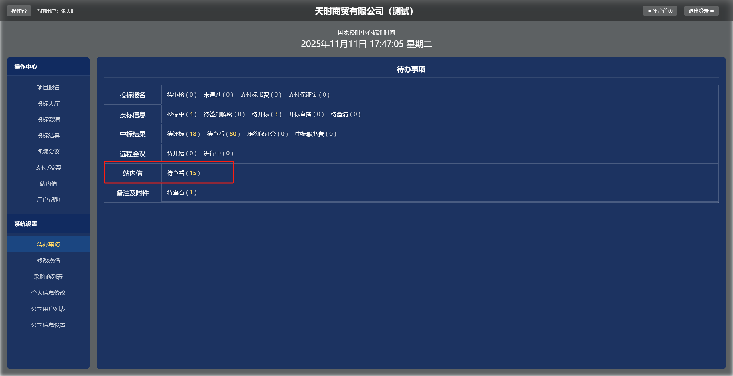 (一)供应商在项目结束以后,等待采购人进行评标,评标完成后会短信邮件告知供应商中标结果,此时供应商可登录系统在“待办事项”中看到有<待查看>的项目,点击<待查看>或左侧菜单栏中的<投标结果>均可以进入到“竞标结果列表”页面