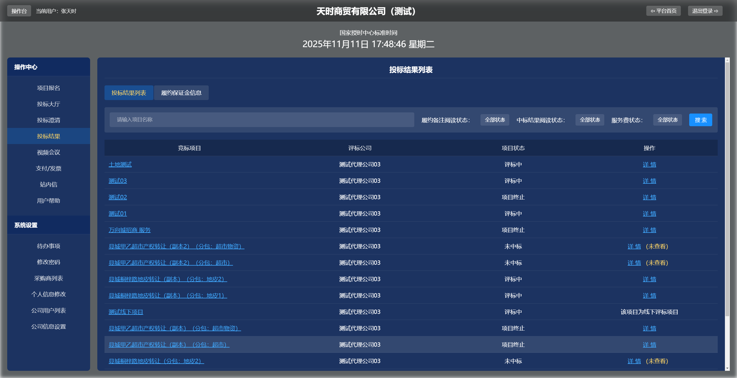 (二)在“竞标结果列表”页面中,可以在“项目状态”栏看到中标状态,点击操作栏中的“详情”可以查看详细信息。如果是已中标的项目,且采购人设置了有合同环节和履约环节,还可以在这里查看合同和提交履约信息